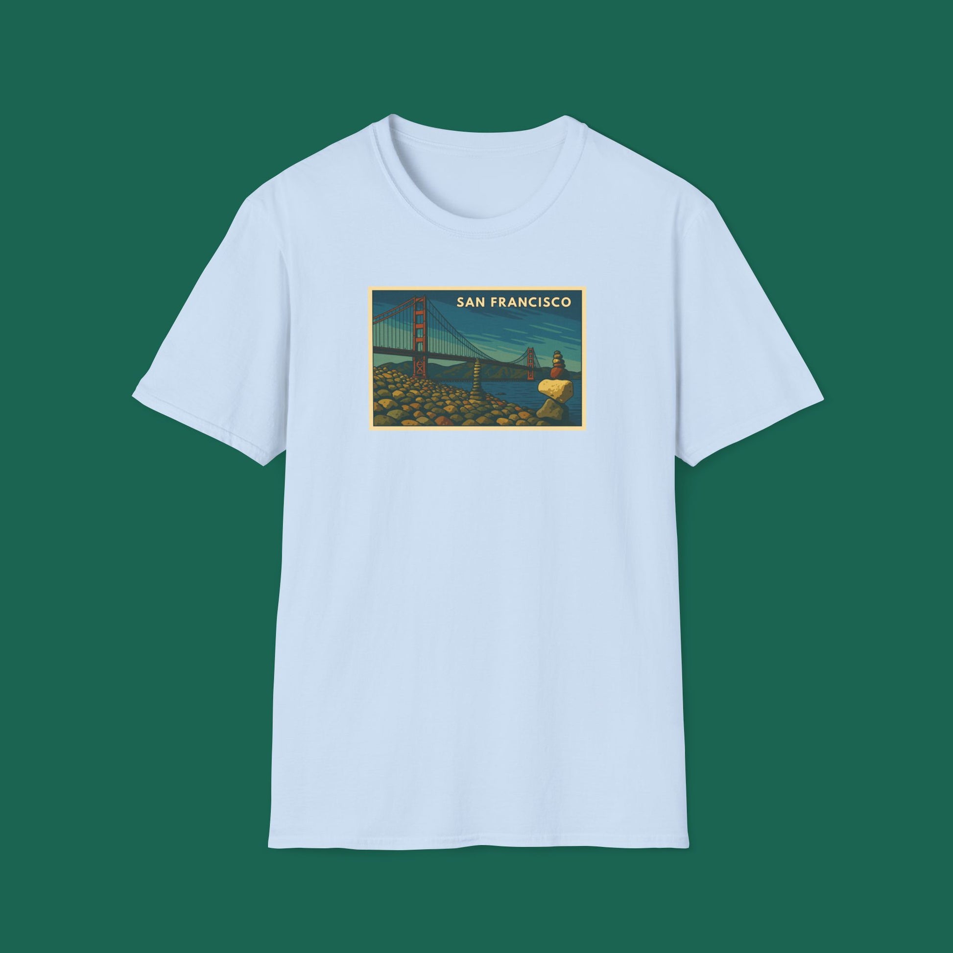 A soft, breathable tee that frames the Golden Gate from an unexpected angle — imagine standing low beneath the bridge, the cables arching overhead, fog softening the city beyond. This shirt carries that quiet, cinematic San Francisco mood: salt air, cool fog, and the steady geometry of iron and cable. Wear it on morning rides across the bay, while wandering waterfront streets, or curled up with a travel book. The image is subtle yet distinct, for people who know the bridge not just as a landmark but as a memory of a certain light and movement.