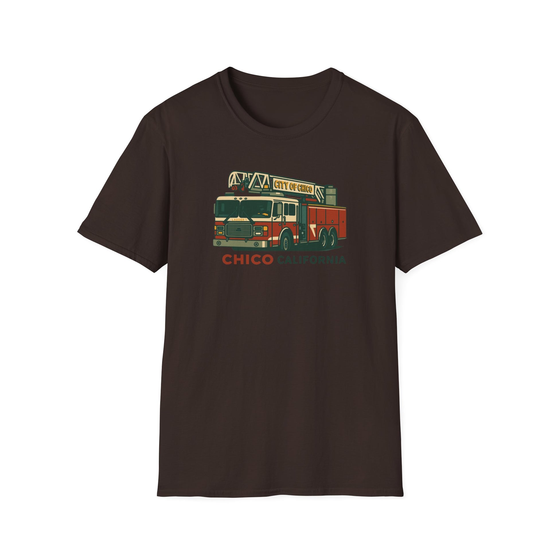 Vintage travel poster style T-Shirt depicting a Fire Truck in Chico, California. This T-Shirt exudes a retro and adventurous vibe, perfect for those who love travel and vintage aesthetics. Ideal for adults looking for a unique and eye-catching shirt to wear on casual outings or as a statement piece. Or a holiday gift!